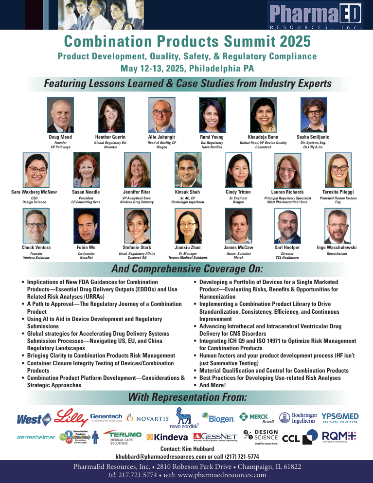 Regulators in North America and Europe are requiring stricter standards for the manufacture and safety testing for combination products in both the Pharma and med device industries. This two-day summit features expert insight into combination product development, and the complex quality, safety, and regulatory compliance issues facing the CP market. Pharma Ed’s Combination Products Summit 2026 provides comprehensive coverage of current and future trends in combination product development for drugs, biologics and medical devices.